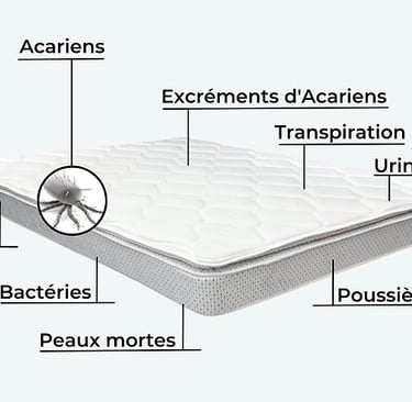 Utiliser un protège-matelas ou une housse est déjà une première étape, mais ça ne suffit pas toujours à empêcher l'infiltration d'acariens, de transpiration, d'huiles corporelles, de peaux mortes et de résidus d'animaux domestiques dans votre matelas. Le tissu des matelas, souvent moins résistant aux taches que celui des tapis ou des meubles, peut rendre le nettoyage difficile. Nos équipes sont formées et équipées pour assainir et traiter les tissus en profondeur afin d’atteindre un résultat impeccable pour préserver hygiène et confort et vous permettre au passage de faire durer la garantie de votre matelas.